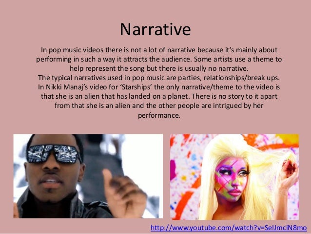 - 4. Narrative In pop music videos there is not a lot of narrative because it’s mainly about performing in such a way it attracts the audience. Some artists use a theme to help represent the song but there is usually no narrative. The typical narratives used in pop music are parties, relationships/break ups. In Nikki Manaj’s video for ‘Starships’ the only narrative/theme to the video is that she is an alien that has landed on a planet. There is no story to it apart from that she is an alien and the other people are intrigued by her performance. http://www.youtube.com/watch?v=SeIJmciN8mo